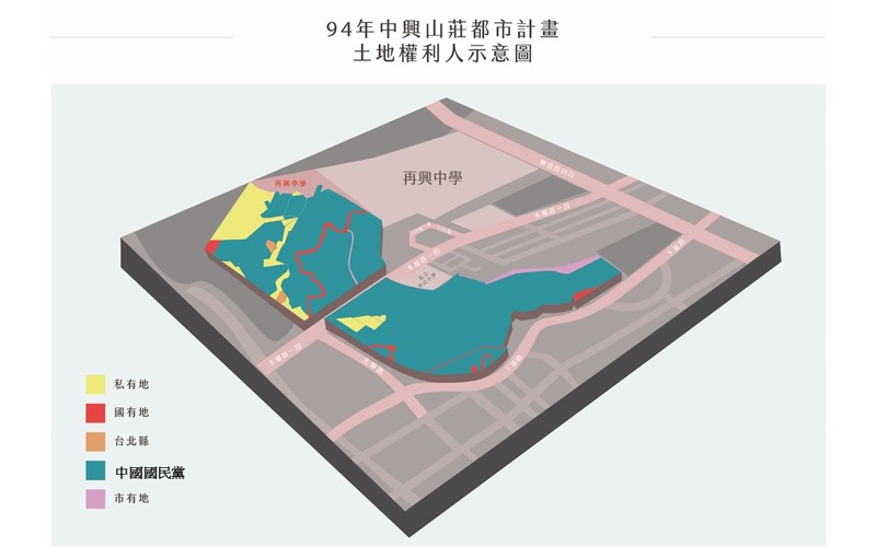 1986年都市計畫通盤檢討案指出,革實院中興山莊北側的機關用地「非提供行政機關使用」(一直都是國民黨中央委員會使用),且土地大部分由國民黨作為訓練使用,故變更北側為「行政區用地」。而南側的革實院得以維持機關用地是因為,當時原位於陽明山的國防部總政戰部「青邨幹部訓練班」與革實院交換駐點,正以政府機關身分使用著革實院的南側土地。簡言之,一開始中興山莊被政府充作機關所在,因此土地被劃為機關用地,之後北側土地因長期「非機關使用」顯然不妥,才被市府改劃為使用較具彈性的「行政區用地」。